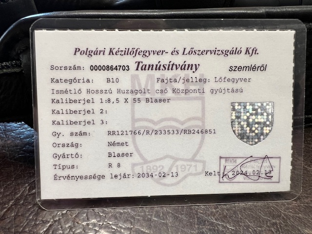Eladó egy beszámított Blaser R8 Ultimate Carbon fegyver. Barna bőr betétek, állítható tushossz, állítható pofadék, ATZL sütés, DLC billentyű és zárfej, 8,5x55 Blaser kaliber, 52 cm-es semi weight bordázott cső, 17x1-es menettel. Carbon fegyverszíj.